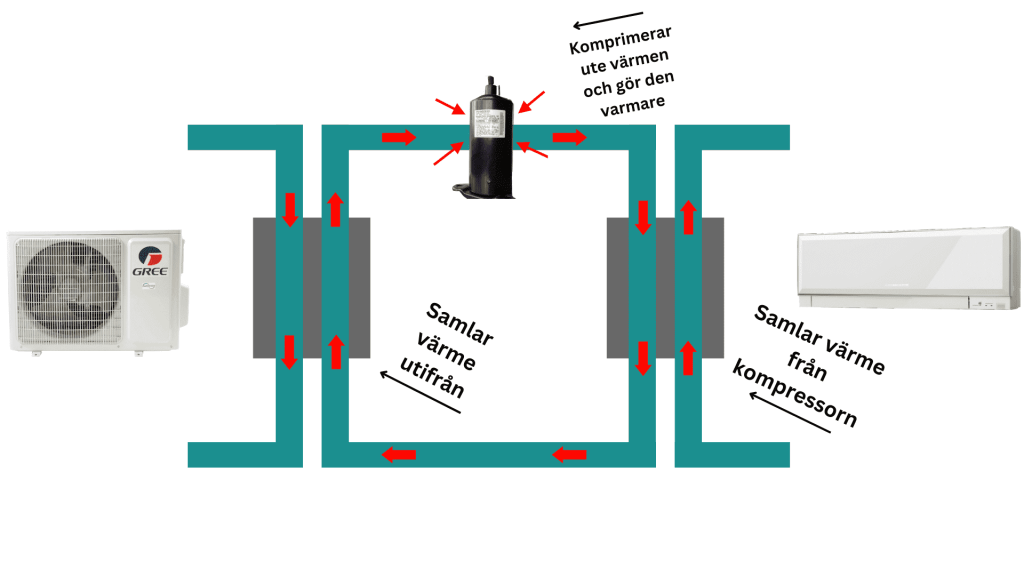 Varför en luftvärmepump fungerar så bra i ett varmare klimat är på grund av vätskan den använder sig av på utsidan av huset alltid snäppet svalare än dess miljö. Vilket leder till att vätskan absorberar värmen omkring sig. Värmen samlas i en kompressor för att komprimeras, så den uppnår högre temperaturer som sedan hettar upp ditt hushåll.